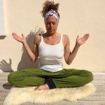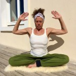 Sit in Sukasana (easy pose) with your spine straight. As you inhale bend your elbows and lift them up and out to the sides. As you exhale powerfully bring the elbows downwards with a great force so that they « clap » against the ribcage. The navel point pumps out the exhalation as the arms impact the ribcage and the breath becomes a real breath of fire. We are playing the rib cage like a drum, the elbows move in to strike the ribs hard and then lift upward to reposition, ready to strike again..Move rhythmically,