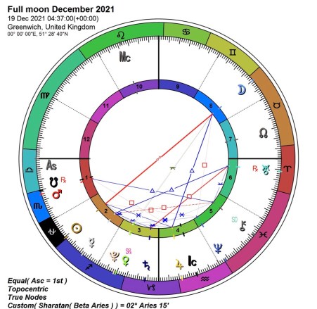 However as the solution and the problem always in the same place. This last Full Moon of the year has the Moon tinged with the influences of both Taurus and Gemini, reflecting the light of the Sun on the Cusp of Ophiuchus and Sagittaire. This brings all four elements into play. So once again Taurus is reminding us of the value of Self reliance, resourcefulness and the support gained by working with the natural world. Gemini is about communicating, dialog and learning from others. Thus, as with all Full Moons, but especially with the Moon trine to Jupiter and Mars trine to Chiron, it can bring the burst of joy that opens new doors. Have faith. Rediscover your own innate wisdom. Expect miracles (changes in your perception) and seize the opportunities that are always available to a soul aligned with truth.